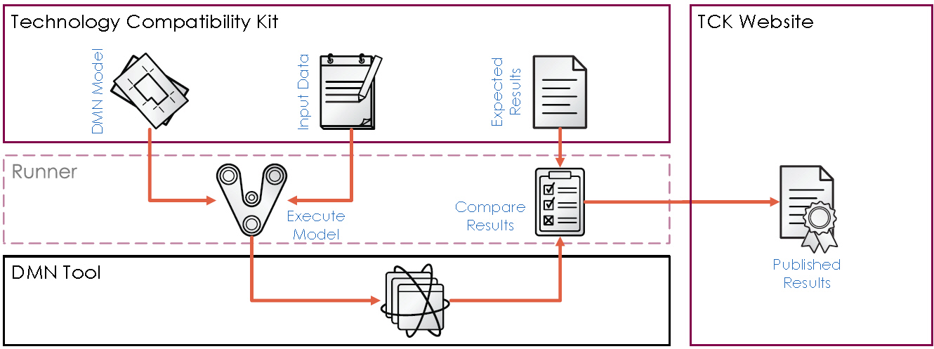 To assist in this, the TCK provides a java runner, free and open source, that reads the model files, invokes the DMN tool, and compares with the results. The TCK provides infrastructure for running the tests, but requires the vendor to implement the vendor-specific component of the invocation. Use of this runner is optional; it is provided only to facilitate automated testing for java-based DMN tools.