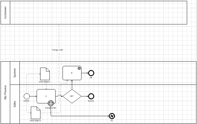 Furthermore, in BPMN 2.0 a non-directional association to a sequence flow is considered a visual shortcut, standing for a directional association from the sequence flow's source node to the data object and another one from the data object to the sequence flow's target node. In any case, Visio Premium cannot create a locked connection between an association and a sequence flow - i.e. the lines may look connected but they are really not. The upshot is that associating a data object with a sequence flow - the most common representation of data flow - is not supported by Visio Premium (in an exportable way). However, explicit data flow using directional associations from source node to data object to target node - the "right" way in BPMN 2.0 - works properly in Visio. Even though that representation is unfamiliar to most modelers today, it is the only way to draw BPMN-exportable data flow in Visio Premium.