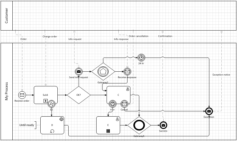 Most of the conventions relate to hierarchical modeling, in which a collapsed subprocess on one page of the model is expanded on a separate hyperlinked page. Visio Premium 2010 supports this via the Process/CreateNew menu pick on a selected subprocess shape. (There is also a Process/LinkToExisting function, but I haven't played with it yet.) The conventions I apply to Visio Premium are, by and large, the same as I apply to structure-aware BPMN tools like Process Modeler for Visio from itp commerce. Here they are: