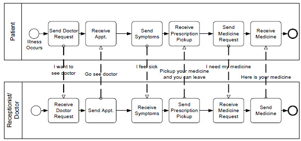In non-executable BPMN, however, human communications between participants is the norm. How else you would explain things like the diagram above, Figure 7.3 in the spec? I suppose you could argue that these message flows are "abstract" and don't strictly represent messages. But the spec never says that, and it's more reasonable to say that in a non-executable BPMN the term message means something more general than a communication bound to a service operation input or output. These message flows seem more like phone calls or emails.