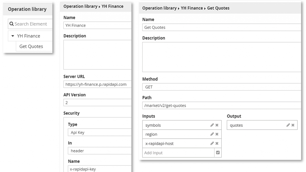 This documentation is all we need to create the input side of the Operation Library entry. Manually add an interface YH Finance and an operation Get Quotes. In the interface properties enter the Server URL and Security (authorization info). In the operation properties, enter the method, path, and under Inputs the required parameters except for the API key, which is entered when the process containing the service invocation is compiled and published. Clicking the pencil for each input lets you specify its datatype, a FEEL type you must create from the documentation. It's actually quite easy!
