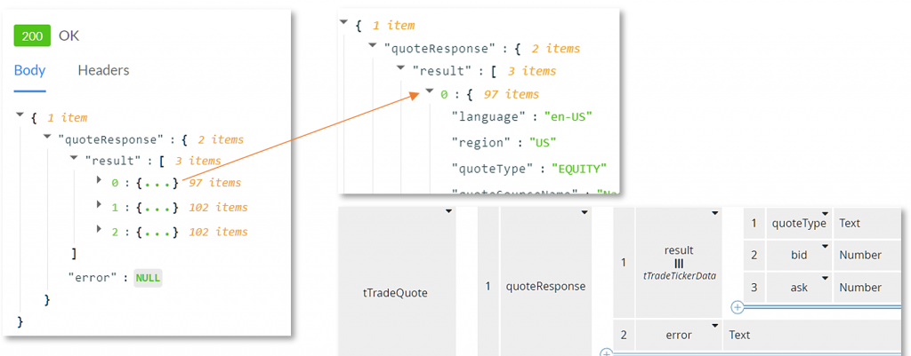 The documentation page then shows the resulting output, as you see here: an outer element quoteResponse with two components, an array of result - one per stock - and error. Expanding result, we see it contains 97 components - wow, that's quite a lot - of which we only need three: quoteType, bid, and ask. But we do not need to construct a FEEL type with all 97 components. As long as we respect the basic structure, we can omit the 94 result components we don't need! So we can create FEEL type tTradeQuote, a structure with enclosing element quoteResponse containing a collection of result plus error, and the type of result contains just the three components we need. When the service is invoked, the json response message is mapped automatically to the FEEL tTradeQuote structure.