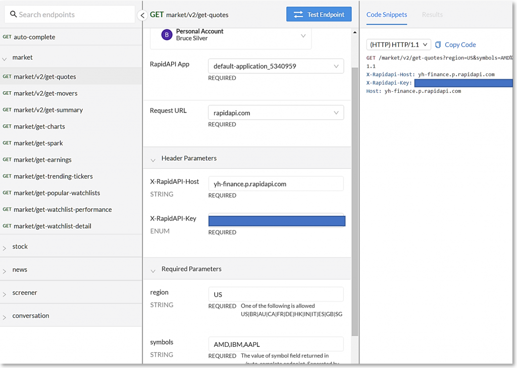 The interface is huge, with operations collected in groups. The one we want is in the group market, with the path /market/v2/get-quotes. Selecting that from the panel on the left, we see the operation documentation in the center panel, which specifies the parameters of the operation, and where in the message they are placed: in the message header, message body, or query portion of the URL. Here two parameters are required in the http message header: X-RapidAPI-Host is the server URL, yh-finance.p.rapidapi.com. X-RapidAPI-Key is the requester's personal authorization credential. Two more parameters are required in the query: region, enumerated text, and symbols, a comma-delimited string containing stock tickers.