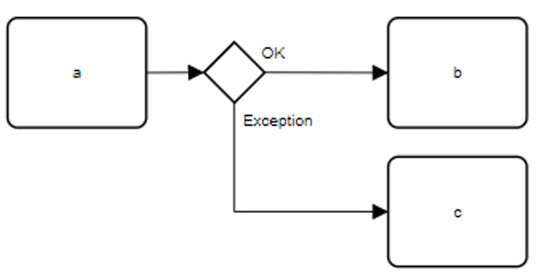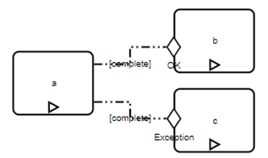 For example, the BPMN diagram above means that task a has end states "OK", leading to task b, and "Exception", leading to task c. CMMN Method and Style borrows this idea, with the task end state indicated by the sentry label of an entry condition triggered by the complete event of another plan item.