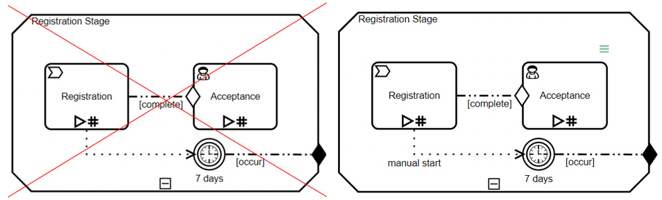 The diagram above means that Registration Stage is terminated automatically (black sentry) if it is not completed within 7 days of the actual start of task Registration. The association labeled manual start defines the trigger of the timer. The timer label defines its duration. The diagram on the left is missing the event label, and thus is a style error. If the timer event listener is missing its duration label, that is also a style error.