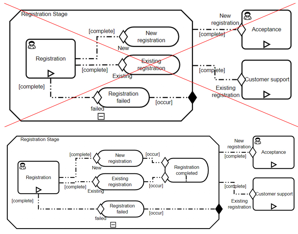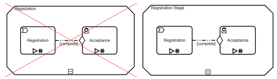 In the diagram on the left, the stage and its enclosed task have the same name, Registration. This is a style error. The diagram on the right is correct.