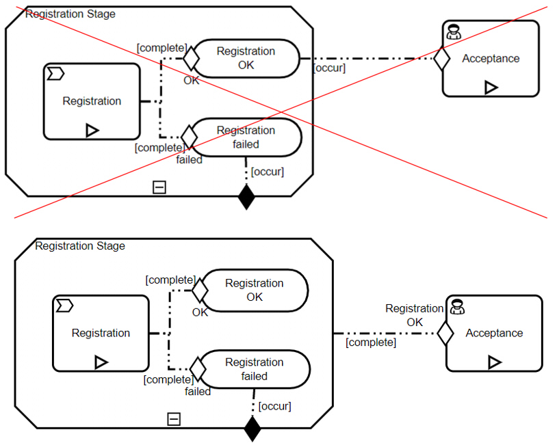 Other style rules resolve inconsistencies in the CMMN spec. Style rule 0100, for example, prohibits ON-link connectors from crossing stage boundaries. In one part of the spec, it says such links are not allowed; in another part it says they are allowed, and in the wild you often see them. But such links do not work when a stage is rendered collapsed, and a basic principle is that the semantics should not depend on an element's graphical rendering. In Method and Style such links are not allowed. The top diagram below is thus a style error; the bottom diagram is correct.