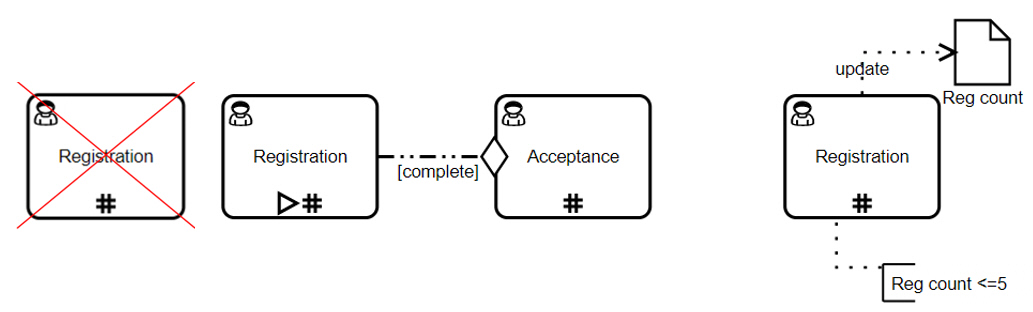 In the left diagram above, task Registration is an infinite loop, a style error. In the center diagram, Registration is ok, since it is manually activated, and task Acceptance is ok as well, since it has an entry condition. In the right diagram, Registration is ok as well, since it has a Repetition Rule that prevents an infinite loop.