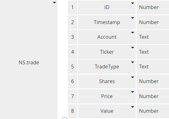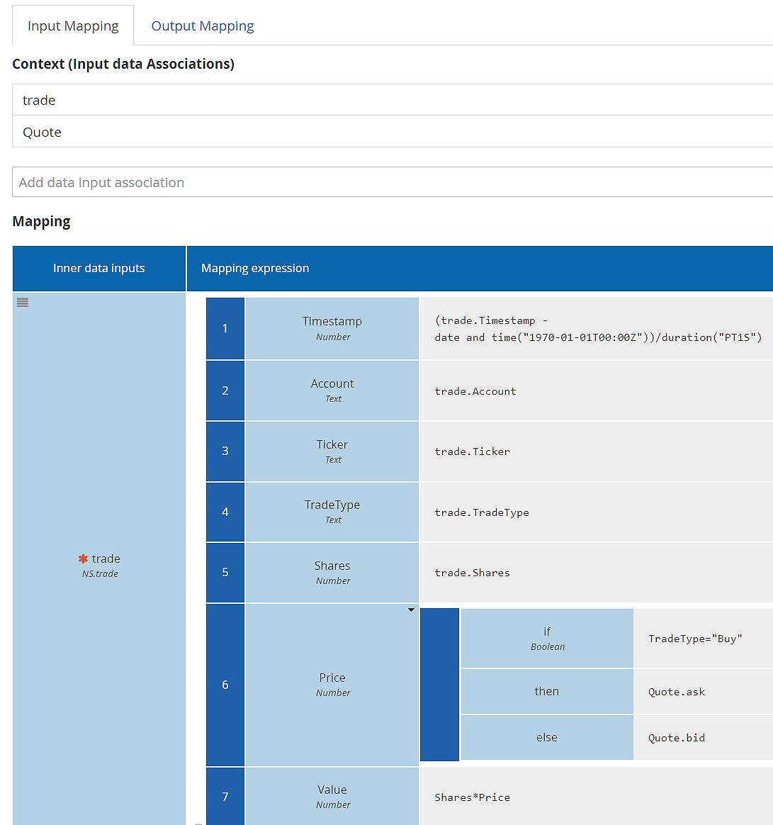 Actually, because the ID value is generated by the database, we need to exclude it from the Input Mapping. Also, the process variable trade uses a FEEL date and time value for Timestamp instead of the Unix timestamp used in NS.trade. We can accommodate these details by using a context in the Input Mapping instead of a simple literal expression. It looks like this: