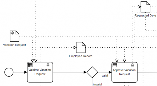 Here you see the process variables Vacation Request (data input), Employee Record (data object), and Requested Days (data object). Vacation Request and Employee Record have data input associations to the Decision task. There is a data output association to Requested Days and two more to variables not seen in this view.