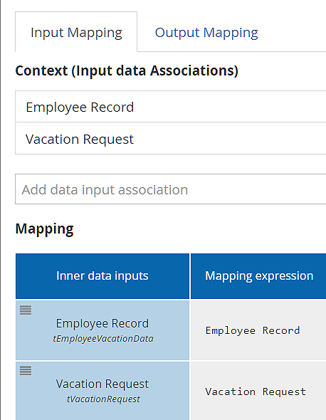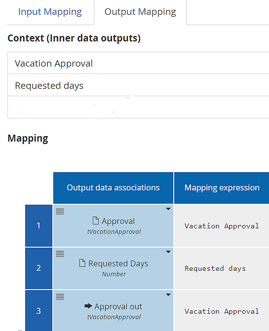 In the Output Mapping below, the task outputs are shown in the Context section, and the process variables in the first column of the Mapping section. The Output Mapping is also quite simple, except note that the task output Vacation Approval is mapped to two different process variables, Approval and Approval out. That is because a process data output cannot be the source of an incoming data association to another task, so sometimes you have to duplicate the process variable.