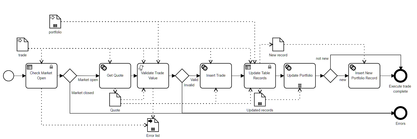 Not all data mappings are so simple. Let's look at the Service task Insert Trade in the process model Execute Trade, below.