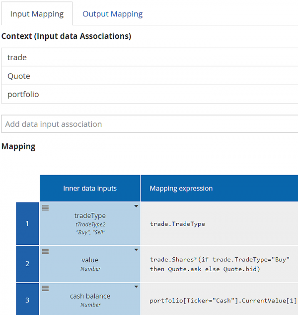 The context allows each component of the task input trade to be mapped individually from the process variables trade and Quote (which provides the price at the time of trade execution). As we saw with the Decision task, the Context section lists the available process variables, and the first column of the Mapping section lists the task inputs. Note also that the Price mapping uses the conditional boxed expression for if..then..else, new in DMN 1.4, designed to make complex literal expressions more business-friendly.