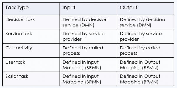 With Service tasks, Decision tasks, and Call Activities, the task inputs and outputs are given. They cannot be changed in the calling process. It is not necessary for process variables in the calling process to have the same name or data type as the task variables they connect to. All that is required is that a mapping can be defined between them.