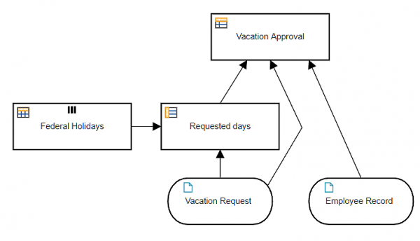 Let's look at some examples. Below we see the DRD of a decision model for automated approval of an employee vacation request, and below that the decision service definition, Approve Vacation Request.