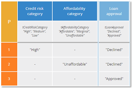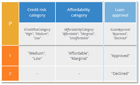 This says if Credit risk category is either "Medium" or "Low" and Affordability category is either "Affordable" or "Marginal", Loan approval is "Approved", otherwise "Declined". Now "Declined" is the lowest priority output. Based on the allowed values of the inputs, the logic is identical to the previous tables. The second P table has fewer rules than the first one, but is it better? That's hard to say. I would tend to favor the first one because if you report which rule was selected, it reveals the specific reason why Loan approval was "Declined", whereas the second one does not.