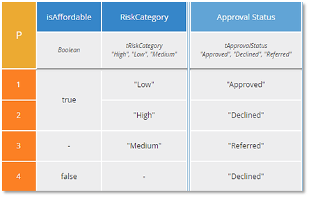 Look at this table and tell me, under what conditions is Approval Status "Referred"? Did you say when RiskCategory is "Medium"? That is incorrect. The correct answer is when RiskCategory is "Medium" and isAffordable is true. When RiskCategory is "Medium" and isAffordable is false, the output is "Declined", because "Declined" is higher priority than "Referred". Rules 3 and 4 are "misleading" because they are non-else rules with a hyphen in some input and the output of one of them (Rule 4) is not lowest priority. Yes, that's a little confusing.