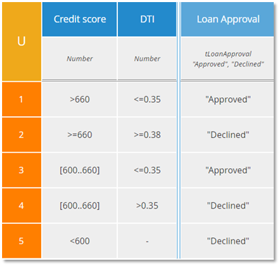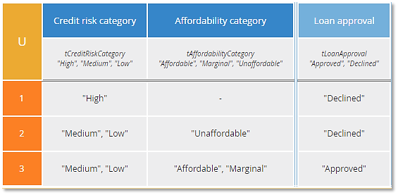 Now rule 2 is simpler because the column 1 condition is hyphen. But notice that if Credit risk category is "High" and Affordability category is "Unaffordable", both rules 1 and 2 match. Those rules overlap. Here the hit policy A (for Any) warns us that rules may overlap, but with A tables overlapping rules must have the same output value. And here they do: "Declined". To me, this table expresses the logic more plainly than the U table: If either Credit risk category is "High" or Affordability category is "Unaffordable", Loan approval is "Declined", otherwise "Approved".