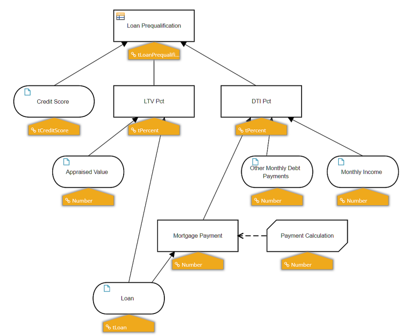 Like decision tables, DRDs are readily understood by business users, who can create them to outline the dependencies of the overall logic. In the view above, we show the datatype of each input data and decision in the DRD. Built-in datatypes include things like Text, Number, Boolean, and collections of those, but DMN also allows the modeler to create user-defined types representing constraints on the built-in types - such as the numeric range 300 to 850 for type tCreditScore - and structured types, specified as a hierarchy of components. For example, tLoan, describing the input data Loan, is the structure seen below: