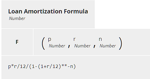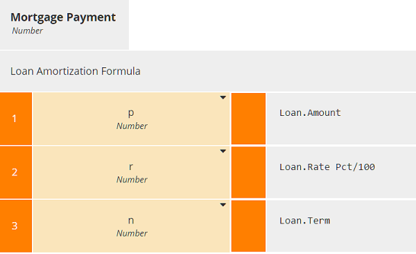 In a boxed Invocation, the name of the invoked BKM is below the tab, and below that is a two-column table, with the BKM parameter names in the first column and their value expressions in the second column. Note that because Loan.Rate Pct is expressed as a percent, we need to divide its value by 100 to get r, which is a decimal value, not a percent.