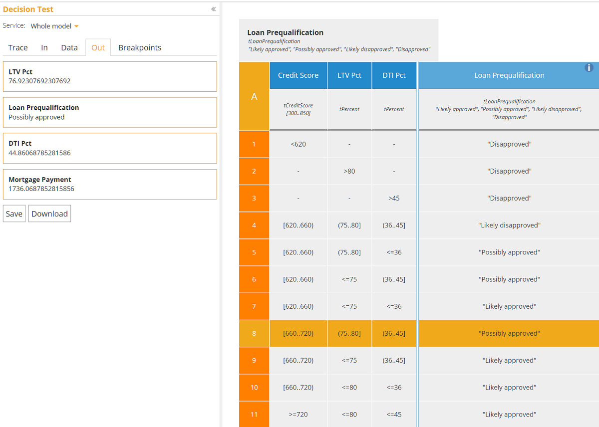 Here Loan Prequalification returns "Possibly approved", and the supporting decision values look reasonable. We can look at the decision table and see that rule 8 is the one that matches.