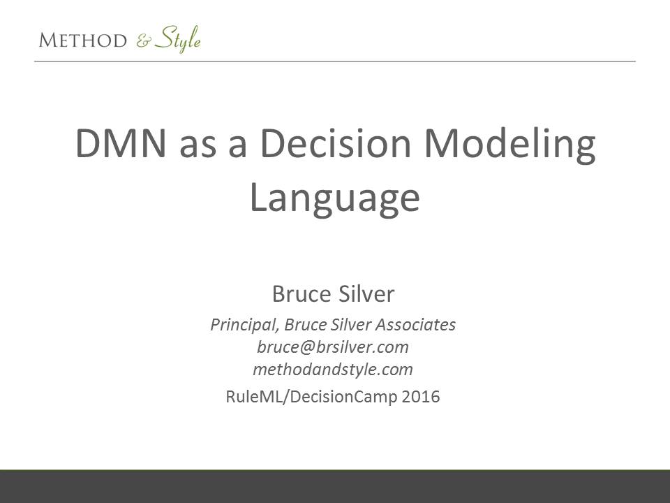 I was surprised to be invited to speak here about DMN, because the inventors of DMN are here in the room but I am not one of them. While they were off inventing DMN, I was working in the related area of business process management, most recently focused on business process modeling using BPMN.