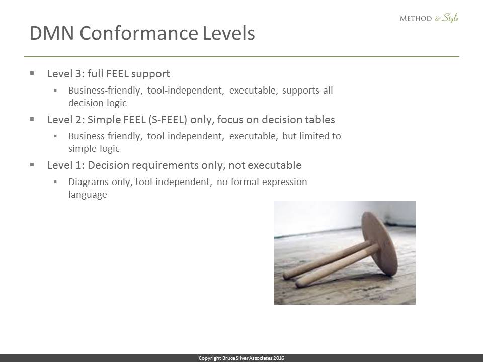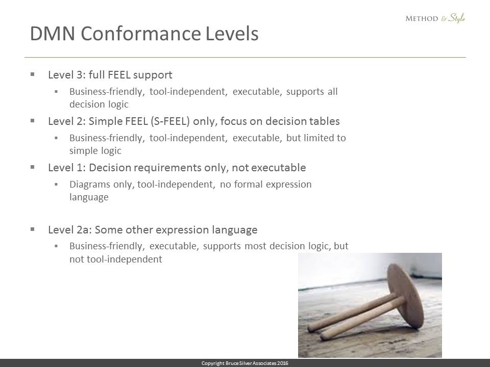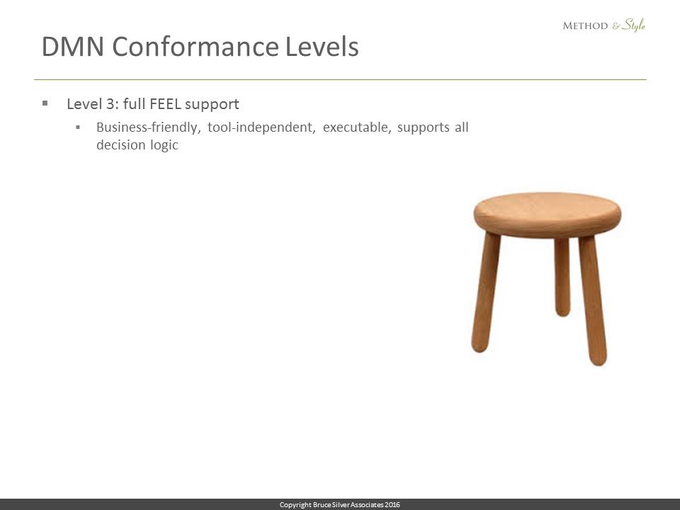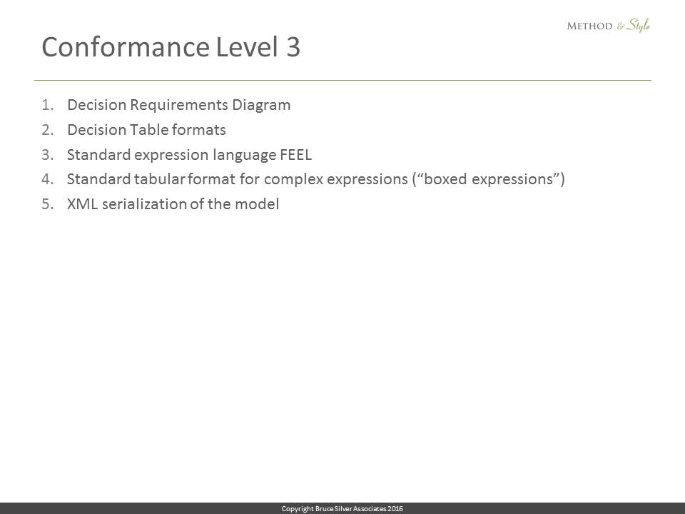 Conformance Level 3 is the real deal. But there is a complication. DMN does not require FEEL as the expression language; it’s just the default. Technically a tool could use Java or something else. That’s allowed. But... conformance level 3 is specified in terms of FEEL only. If a tool implements some other language, the meaning of the model is no longer tool-independent.