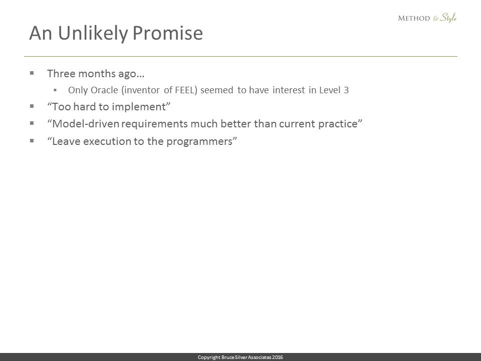 I say fulfilling the promise seemed unlikely because, among those vendors active in the DMN task force, only one seemed to have any interest in implementing Level 3. It was just too hard, and besides, Level 1 and 2 already offered a big improvement over current decision management practice. It was not just that partial implementation was a faster way to get a tool to market. Vendors were arguing that generating requirements for implementation in some other engine-specific rule language was a viable long-term strategy. I found that consensus deeply disappointing, because the lesson of BPMN over the past decade is that in the long run, that approach doesn’t work. The promise that works is What You Model is What You Execute.