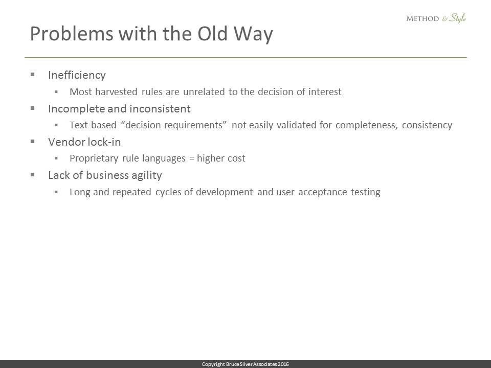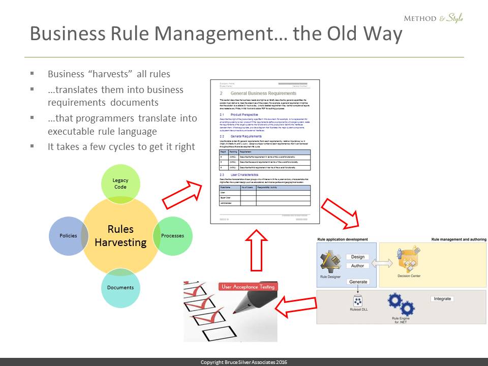 Decision management for many years was called business rule management. The change in terminology, and DMN’s strong association with that change, signifies a break from the traditional practice of business rule management, which asked the business to start by hunting down and harvesting all the rules buried in application code, in policy manuals, processes, and in the heads of subject matter experts, so they might be centrally managed and executed on a business rule engine. The harvested rules are written down in the form of text-based business requirements, which are given to programmers for translation into a rule language specific to a particular business rule engine. But text-based business requirements are notoriously vague and internally inconsistent, resulting in user acceptance problems, and so the cycle repeats. And that’s not the only problem. Over time, in decision-intensive businesses like financial services, the organization will accumulate thousands of rules, so simply managing them, refactoring them to deal with changing business requirements becomes extremely difficult.