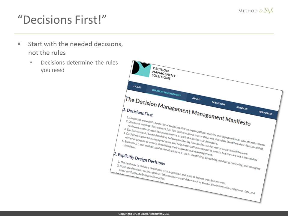 A decade ago, a new idea called decision management began to challenge this traditional practice. James Taylor’s Decision Management Manifesto introduced the “Decisions First” mantra, attacking the practice of starting by harvesting all the rules. Instead, he said, business users should start by understanding the decisions they want to make and the information they require. The rules follow naturally from that.