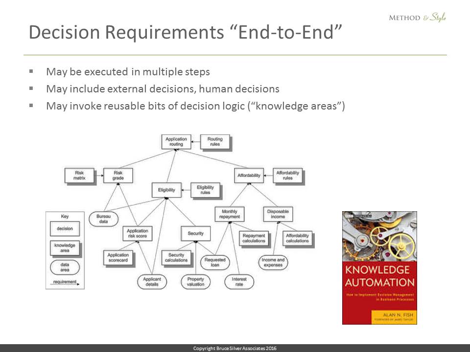 TDM diagrams focused on the logic of individual decisions, or what DMN would call an individual decision service. In his book Knowledge Automation, Alan Fish of FICO introduced the notion of end-to-end decision requirements diagrams (DRDs) representing business decisions executed in multiple steps, including external decisions and human decisions.