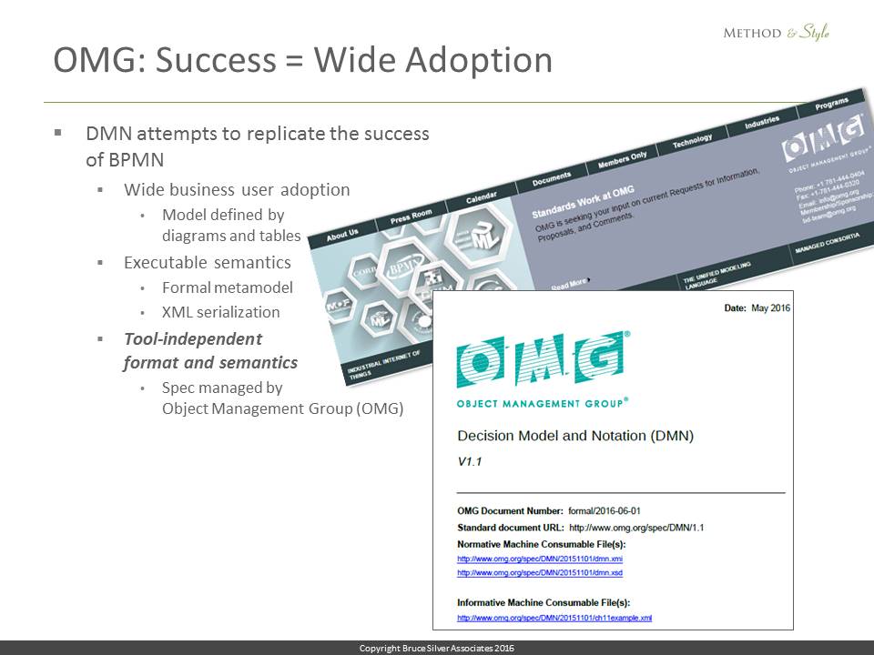 But that background is relevant to my talk today because DMN, the new decision modeling standard from the Object Management Group (OMG), is now attempting to replicate the success of BPMN. Whether DMN succeeds or fails in that attempt, I believe, depends on whether implementers heed the lessons of the BPMN experience. OMG measures the success of its standards by breadth of adoption, and by that measure BPMN has been very successful, widely adopted by both business users – notoriously averse to standards of any kind – and technical users. Acceptance by business was, from the start, always an explicit goal of BPMN, as it is now for DMN.