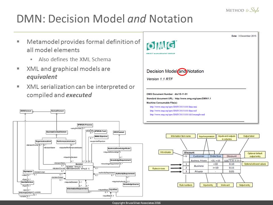 The XML representation of those diagrams and tables can be executed on a decision engine. So... like BPMN, DMN embodies the dream of a common language shared by business and IT. The decision logic, end to end, even if it requires multiple steps, can be defined by the business people themselves. Because that logic is model-based, it is verifiable for completeness and consistency at design-time. And here is the best part: the meaning of the diagrams and tables does not depend on the tool that created it. It’s defined in a spec. The formats and syntax of the language are both tool-independent and executable. Provide it with values for the inputs, and the engine can determine the value of any decision node in the DRD. For high volume production, of course, you could also map the DMN XML to the rule language of a commercial rule engine.