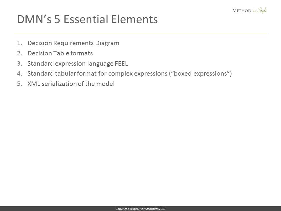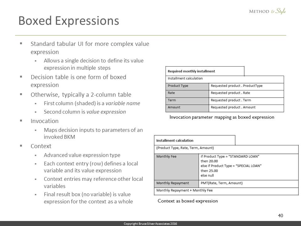 - Standardized tabular formats for all decision logic, called boxed expressions
