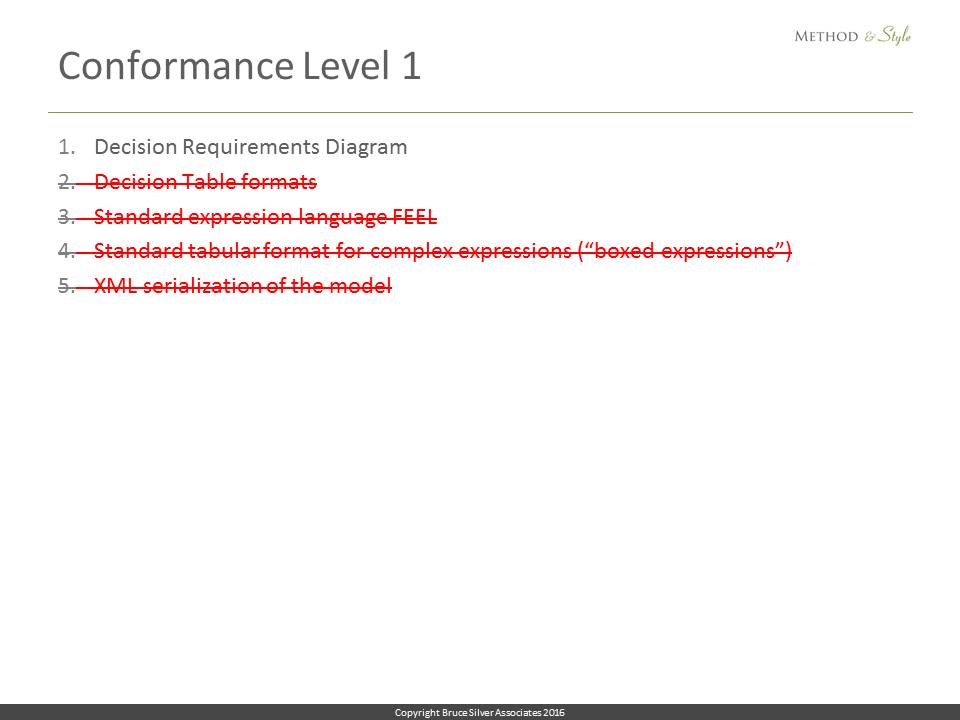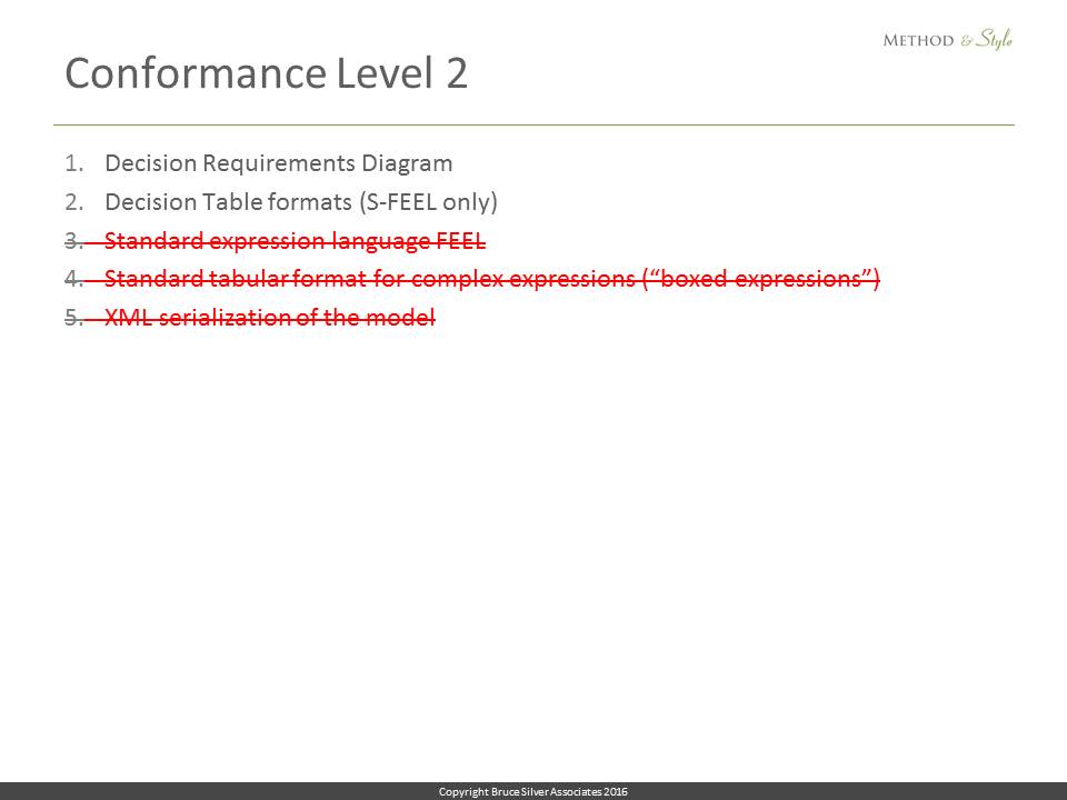 Conformance Level 2 means DRDs and decision tables conforming to S-FEEL S-FEEL is very simple, just basic arithmetic expressions and comparison tests. It can’t do string manipulation or date-time arithmetic or table queries, but its logic can be verified for completeness and consistency, and has the possibility of being mapped to tool-specific rule languages for more advanced decision logic. So It’s a lot better than Level 1 but still not the real deal.