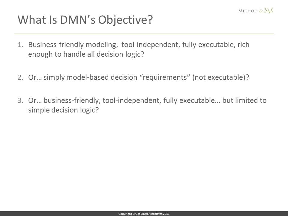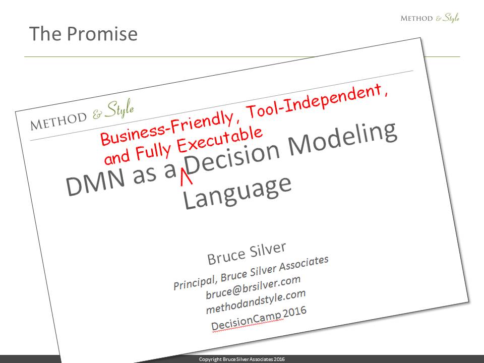 Three months ago, when I began thinking about this talk, it seemed unlikely that DMN would ever fulfill its promise, because even the objective of full business-empowerment was not widely shared by its key implementers, those active in the DMN task force in OMG.