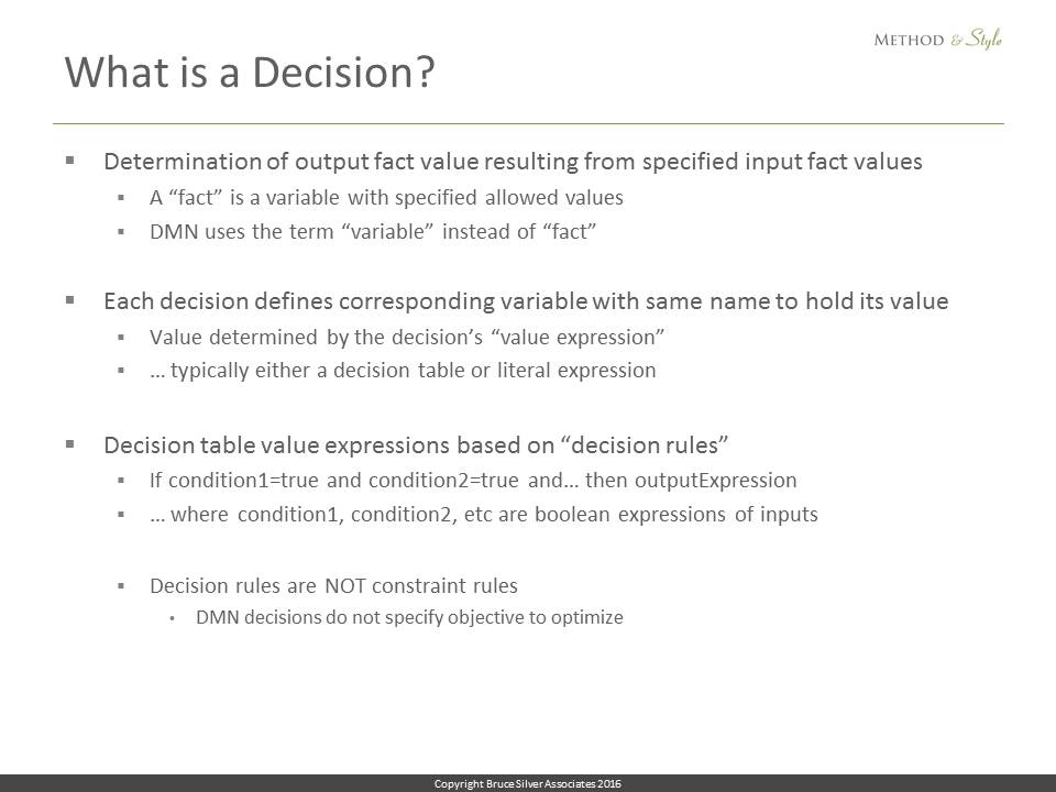 First, what is a decision? As we said, it’s determination of an output fact value from a given set of input fact values, where a fact, in DMN terminology, is a variable with a specified domain of allowed values. In DMN, each decision is comprised of a variable that holds its output value, and a value-expression that contains the logic that determines that value. DMN’s value expressions are based on decision rules: if condition1 is true and condition2 is true, then the output value is X. Decision rules are a class of business rules, but not all business rules are decision rules. For example, constraint rules are not decision rules.