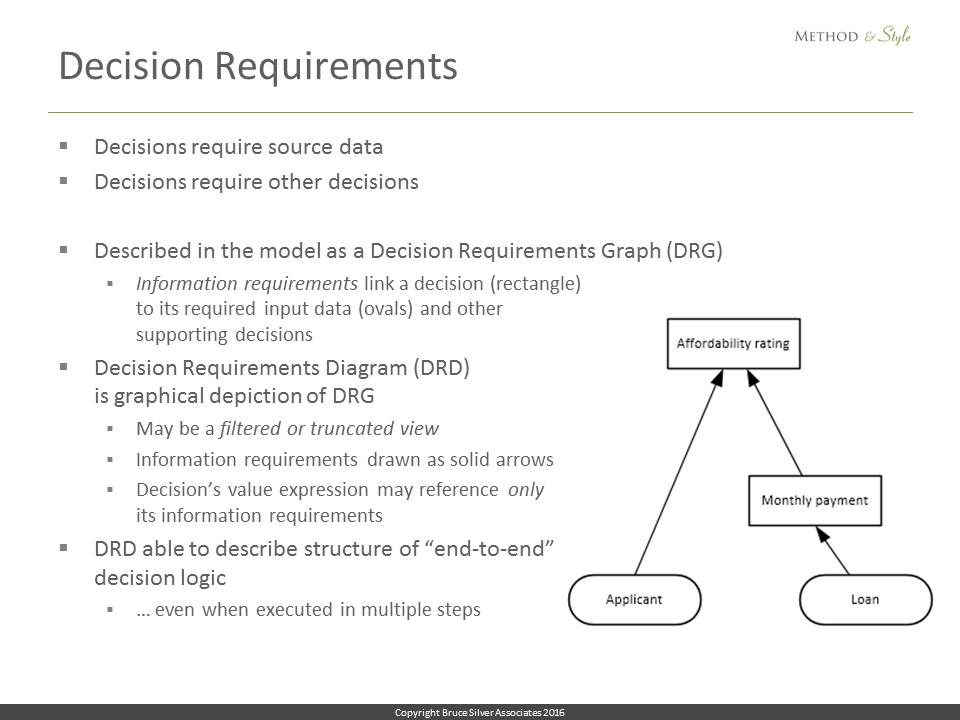 Decision requirements. Going all the way back to the decision management manifesto, we know that decisions require information in the form of source data and supporting decisions. DMN describes these dependencies in the form of a Decision Requirements Graph or DRG, the complete network of all supporting decisions and input data required by any decision node. The visualization of a Decision Requirements Graph, is called a Decision Requirements Diagram or DRD. Rectangles in the DRD are decision nodes, ovals are input data. The value expression for any decision node may only reference other DRD nodes directly connected by information requirements, the solid arrows. So the decision Affordability rating here only depends on the variables Applicant and Monthly payment.