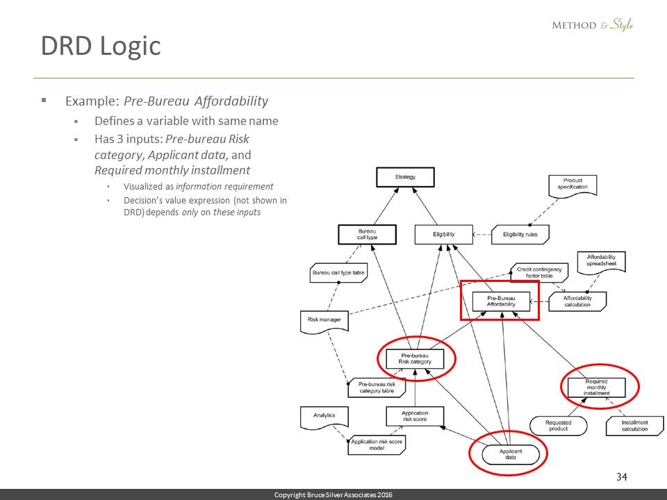 This example illustrates the mechanics of a DRD. Let’s look at the decision Pre-Bureau Affordability. It defines a variable of the same name. It has 3 inputs: Pre-bureau Risk category, Applicant data, and Required monthly installment, so its value expression can depend only on those 3 variables.