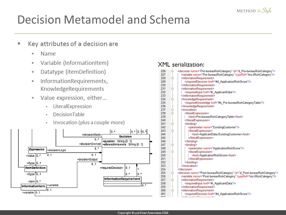 On the left here you see a fragment of the metamodel for a decision, a UML class diagram, showing the links to its information requirements, its value expression, and its associated variable. On the right you see the XML serialization of a particular decision, in which the xml elements correspond to those defined by the metamodel.
