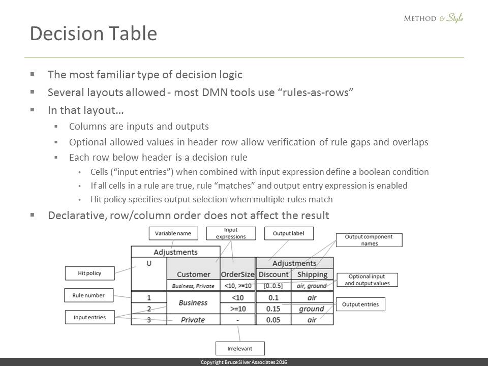 The most common format for a decision’s value expression is a decision table, for which DMN allows a variety of layouts. This one is the default, called rules-as-rows, where the columns represent decision inputs and outputs. The heading row defines their names and allowed values, and the rows below that define the rules. Each input cell in a rule, called an input entry, when concatenated with the input heading defines a Boolean condition. If all conditions in a rule are true, the rule is said to match and the expression in the output column is selected as the decision table output value. There may be multiple output columns, as you see here. The hit policy code in the top left specifies what to do if multiple rules match. Except for a couple of semi-deprecated hit policies, decision tables are fully declarative; neither the order of rules nor the order of inputs changes the result.
