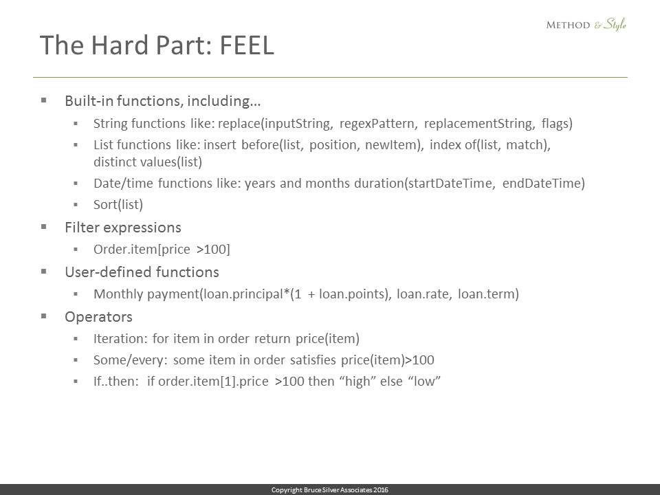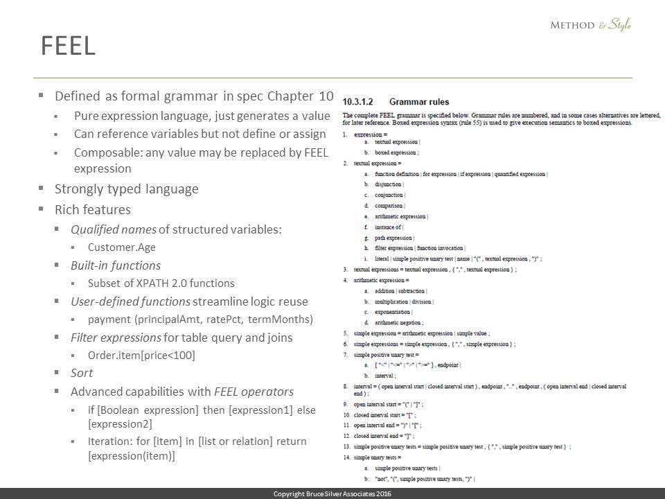FEEL has a rich set of built-in functions, effectively a subset of the XPATH built-in functions, and modelers can define and invoke custom functions as well. It includes filter expressions for table queries and joins. For example, Order.item[price<100] selects from the table variable Order all child elements item for which the attribute price is less than 100. It can perform sorting, if..then..else logic, and iteration. So you don’t need to exit to SQL for queries or to BPMN for iteration, since these are already built into FEEL. But the richness of the language is undoubtedly a barrier to its implementation.