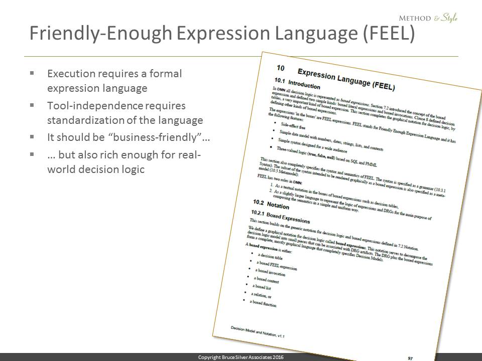 Decision tables and other forms of decision logic contain expressions. To be both executable and tool-independent, DMN requires a standard expression language for those: That is FEEL, which was settled on after long and contentious debate. Languages like UEL were rejected as not business-friendly. There were some who advocated using the Excel formula language – by definition, business-oriented – but in the end DMN invented its own language.