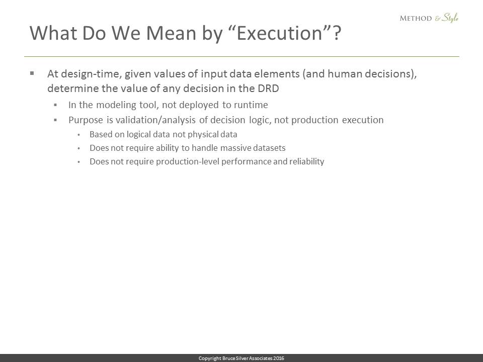 I have been using the term executable, but that doesn’t mean a modeling tool must include a production DMN runtime engine. What I mean is that at design time, given values for all the input data, the tool can display the resulting output for any node in the DRD. Modelers need that for verifying the decision logic they are defining. So we’re talking about test data, logical data, not physical data extracted in mass quantities from real production systems and databases. If you need to handle large datasets in production, or execute the decision logic very fast, you still may want to map the DMN model to the rule language of a commercial business rule engine.