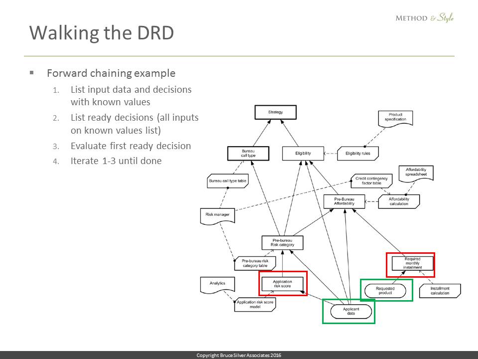 Actually, walking the DRD is the easy part. Here is how it might be done with forward chaining. First, generate a list of all elements with known values. To start, that would be the inputData, outlined here in green, Applicant data and Requested product. Then generate a list of all decisions ready for evaluation, meaning all their information requirements are in the known list. Those are the nodes outlined in red, Application risk score and Required monthly installment. Then pick one of the ready nodes, and evaluate it.