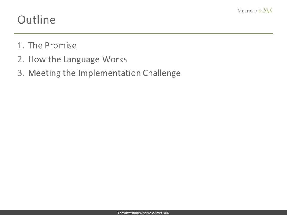 So my talk has 3 parts. Part 1, The Promise, gives a little background on DMN and its promise, and what realizing that promise will entail. Part 2, How the language works, explains how DMN models defined entirely through diagrams and tables can be executable. And Part 3, Meeting the Implementation Challenge, discusses the difficulties that 3 months ago made it look unlikely that DMN would ever deliver on its promise, and ends with recent developments that suggest that DMN is not only likely to achieve its promise after all, but will begin to do so this year.