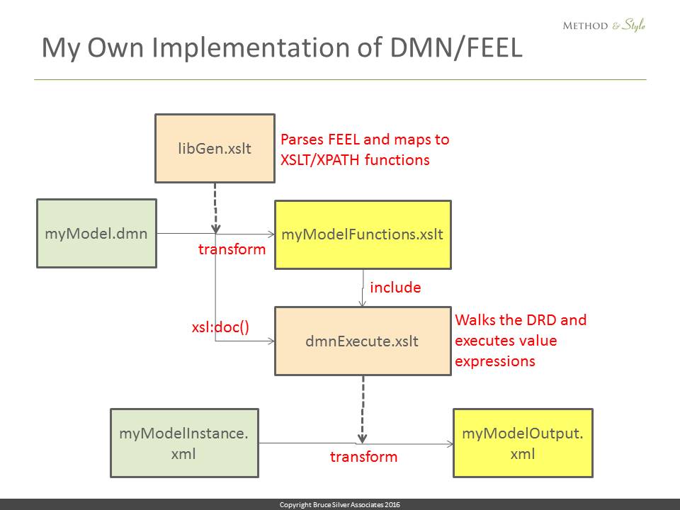 I created 2 transforms, libGen and dmnExecute, here in beige. libGen transforms the serialized model myModel.dmn, in green, to generate a custom function library, myModelFunctions, here in yellow. Every FEEL expression in the original model is mapped to an XPATH expression in myModelFunctions, referencing an element in the knownValues list generated by walking the DRD.