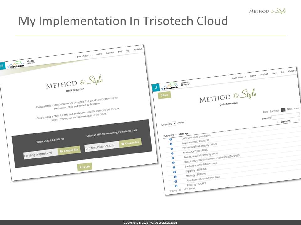 Of course, no one wants to do this manual 2-step procedure on some obscure tool like XMLSpy. But in an unbelievable gesture of goodwill, Trisotech offered to host it for me in their cloud using Saxon, including gluing together the 2 steps. I thought it would take them 3 months, but about a week later I got a message, it’s ready. So here it is, on the left: upload the model – lending-original.xml – and the inputdata instance file, lending instance.xml, click Execute. And the result is shown on the right. Pretty cool.