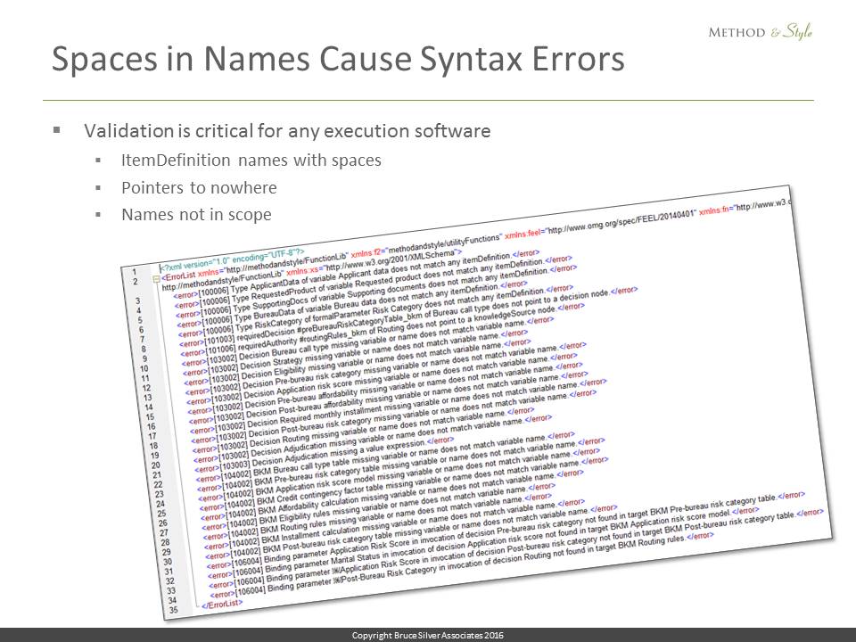 But here’s something I discovered: Having spaces in names not only complicates the parsing, but makes errors in the serialization much more likely, especially in this early phase when most xml examples are being created by hand. Pointers to nowhere because of a slight spelling discrepancy, or case mismatch between a name in FEEL and the name of the referenced decision. Errors like these cause my implementation to hang. So as soon as I started working with Trisotech on the cloud implementation, I realized I needed to include model validation in my code. Any real implementation is going to have to do this.