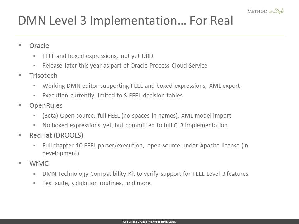 - The Workflow Management Coalition project for DMN Level 3 is just getting going. It will provide a DMN Technology Compatibility Kit, including test cases for all the Level 3 features and capabilities, validation code, and maybe some running code.